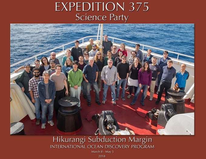 国际大洋发现计划(IODP)375航次的钻探地点位于南太平洋Hikurangi俯冲带边缘。执行本次航次的决心号从2018年3月8日从新西兰提马鲁港出发,至5月5日结束抵达新西兰奥克兰港上岸结束考察。本航次共有来自包括美国、中国、日本、新西兰、德国、英国、法国、意大利等IODP成员国的32位科学家,专业涵盖构造地质学,岩石物理,沉积学等。