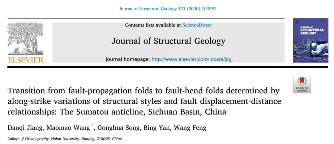 娱乐城 海洋地质系2017级硕士研究生蒋丹琦等通过三维地震数据解释和正演模拟来探究构造样式和断层位移—距离关系对逆冲褶皱三维演化的影响,提出了四川盆地苏码头背斜的时空演化模型,并表明该构造变形机制的横向转变是由于构造不同段处于不同的褶皱变形阶段。该研究成果发表在2020年2月地学知名期刊《Journal-of-Structural-Geology》(2019年IF=3.128,中科院分区2区)上。