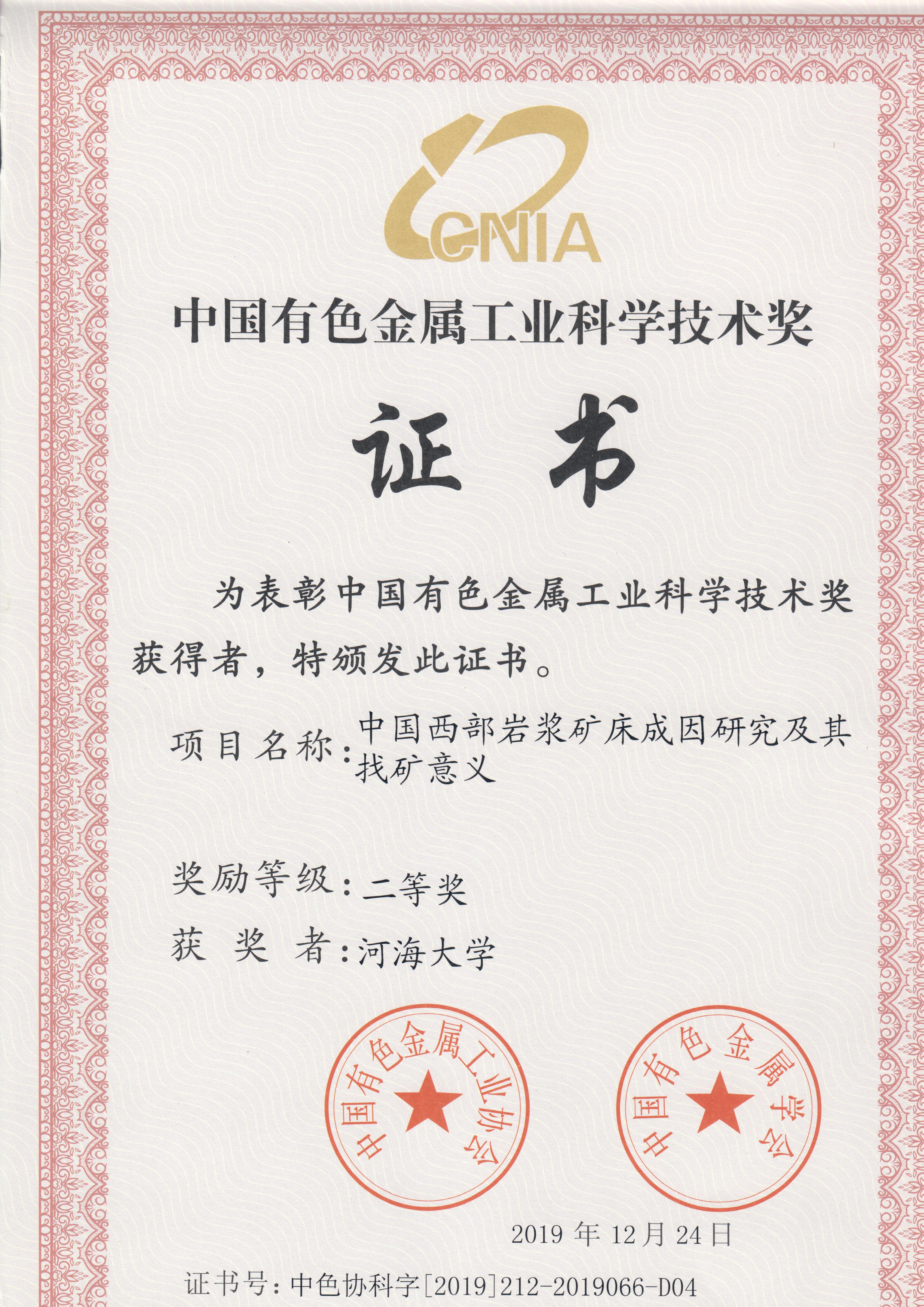 中国有色金属工业科学技术奖获奖证书