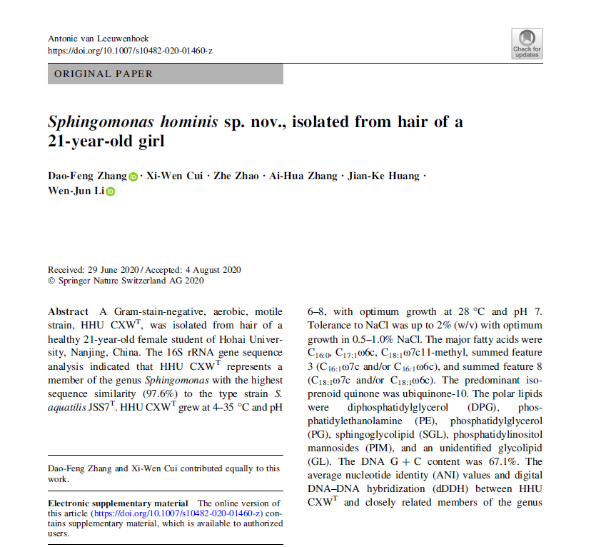 该文章分离、鉴定了一株从崔希雯同学头发上分离得到的一个之前未被正式描述的细菌新种,并命名为Sphingomonas hominis——人鞘脂单胞菌,这株细菌的分离、培养和初步鉴定工作,均是在常规的《海洋微生物学实验》教学过程中完成的。