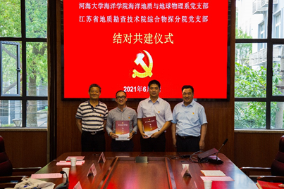 6月1日,娱乐城 海洋地质与地球物理系党支部前往江苏省地质勘查技术院,与该院的综合物探分院党支部开展“联学共建聚向上,服务发展高质量”的共建活动。本次共建活动由省勘查院副院长罗传根同志主持,娱乐城 院长、党委委员齐义泉同志和省勘查院院长、党委书记刘建东同志出席了共建活动。