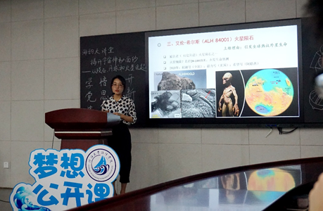 蒋云老师首先介绍了陨石的定义和来历,通过丰富的图片以及现场实物展示,详细讲解了一些特殊陨石的研究方法以及研究价值,比如史上被研究得最彻底的阿连德(Allende)陨石、引发全球热议外星生命的艾伦-希尔斯(ALH 84001)火星陨石、准确测定地球年龄为45.5亿年的代亚布罗峡谷(Canyon Diablo)铁陨石、全球最美陨石新疆阜康陨石等。随后以中国仅有的两大陨石坑(辽宁岫岩陨石坑和黑龙江依兰陨石坑)为引,蒋云老师讲述不同大小尺寸的陨石撞击地球的危害和影响。接着,她将内容延伸到月球、火星、太阳系、银河系以及整个宇宙,在时间尺度上带领大家纵观神奇的天文现象,唤醒了在座观众对宇宙的大局观和纵深感,最后以当代天文研究的“一黑两暗三起源”三大科学问题结尾。