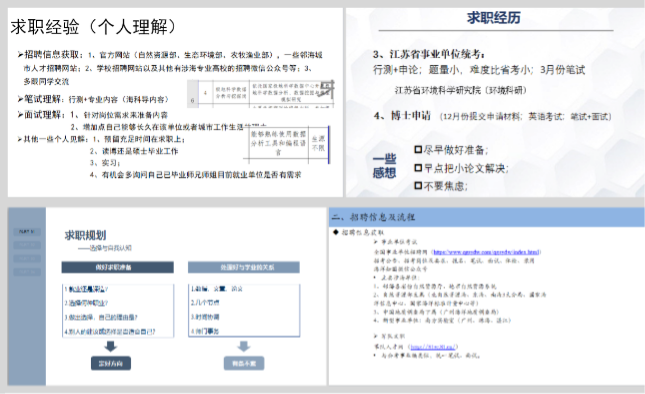 接下来,五位优秀毕业生代表分别根据自己的实际经历展开了详细的分享。目前就职于中华人民共和国教育部的杨纯懿学长从求职规划、备考技巧、求职心态、避坑经验等四个方面进行讲解,叮嘱同学们要根据自身情况进行职业道路选择,并始终保持乐观心态。就职于国家海洋局南海调查技术中心的陈栋学长,着重为大家介绍了获取招聘信息的途径以及在求职中的注意事项。成功签约到中国极地研究中心的张浩然学长重点讲解了面试技巧,他提醒面试不仅要针对岗位准备内容,还要向工作单位展现想要留下的强烈意愿。李兰满学姐目前就职于江苏省海涂研究中心,她主要介绍了事业单位考试的流程及时间节点,并以自身经历劝诫学弟学妹尽早做好就业准备,早日完成学习任务,从容应对焦虑心态。已上岸江选调生的王煊学姐从选调生定义、选调流程、备考经验三个环节展开叙述,使得同学们对选调生有了进一步的了解。