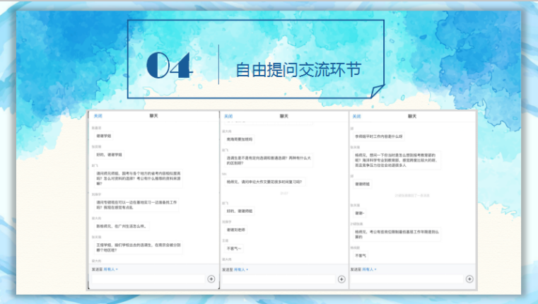 在最后的提问交流环节中,同学们纷纷在互动区提出问题,并得到了学长学姐们的耐心解答。本次分享会持续了约两个半小时,学长学姐们的倾囊相授使得同学们对未来的职业方向有了更加明确的规划,了解了就业应具备的专业素质应聘技巧。