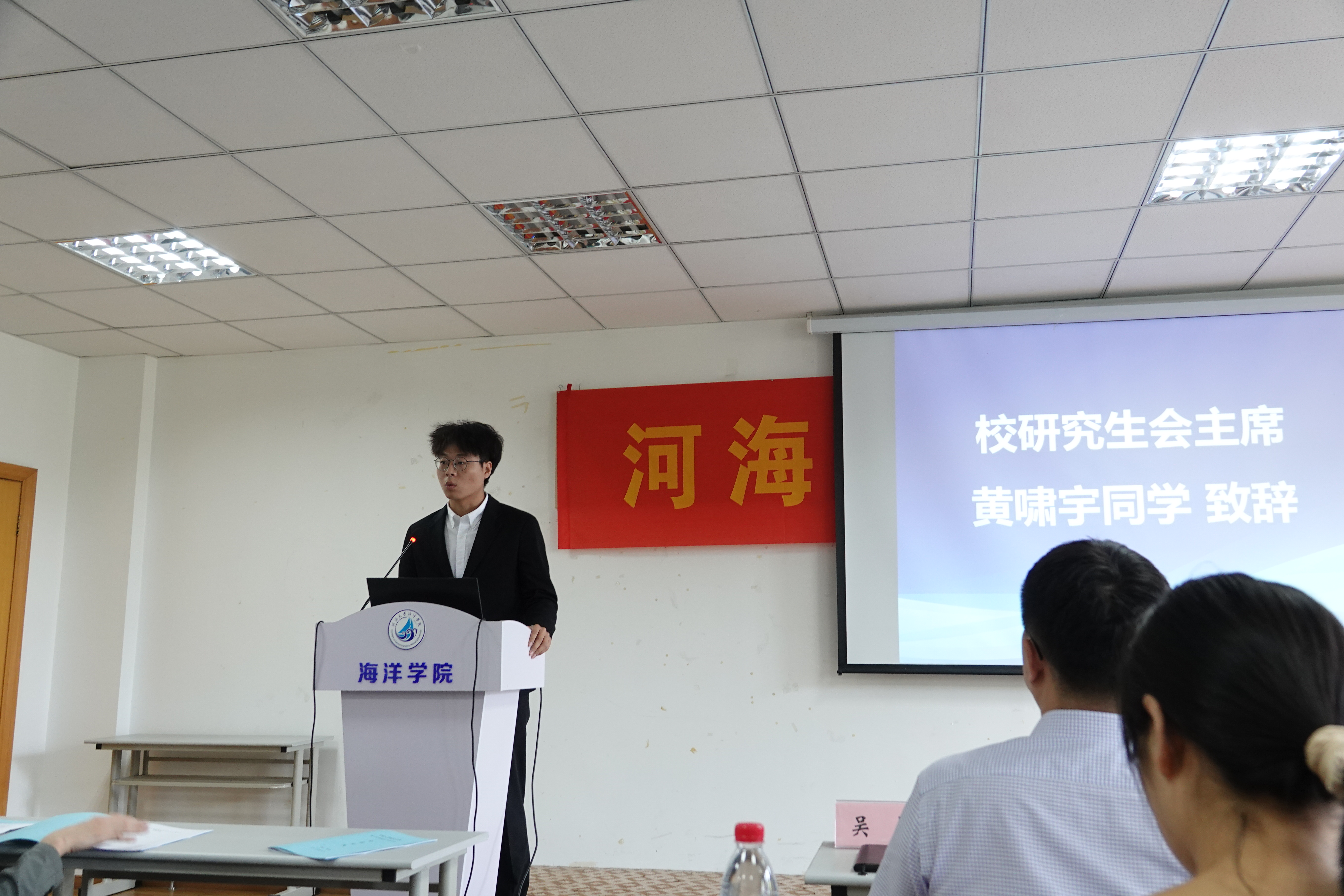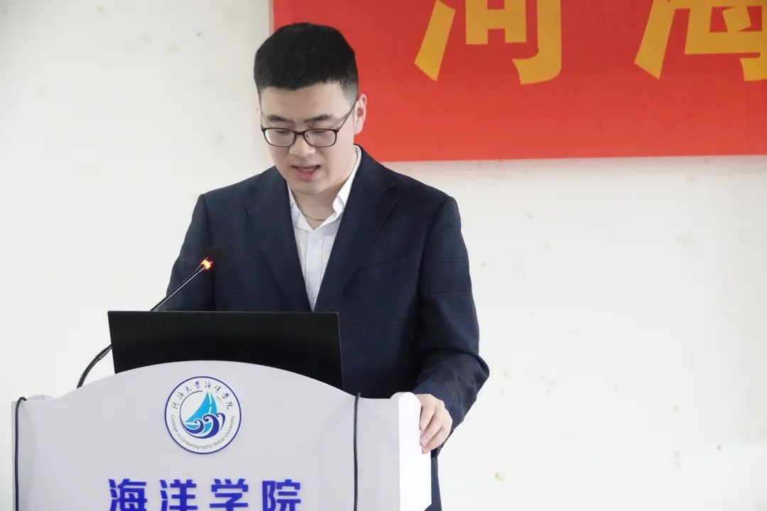 院党委书记胡忠华致开场辞,在讲话中代表学院对大会的召开表示热烈的祝贺,向支持娱乐城 研究生会发展的校团委、各职能部门、院党委和各学院表示诚挚的感谢,对过去一年研究生会开展的工作和取得的成绩予以高度肯定。借此机会,胡书记对各位代表提出三点要求:新一届研究生会要不断加强工作创新、研究生会成员要不断加强自我革命、全体研究生同学要积极支持新一届研究生的工作。希望各位把握机会,加强研究生会的自身建设,提高学生组织的凝聚力和执行力,充分发挥研究生会在娱乐城 各项工作中的主力军作用,带领全院研究生携手共进,不负韶华、不负时代、不负人民,扛起“进军深海大洋,探索学科前沿,服务海洋经济”的责任,以崭新的形象和良好的精神风貌共同迎接新的挑战,展现当代海洋人应有的风采。
