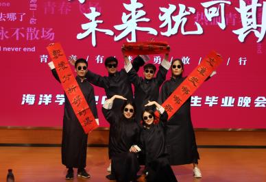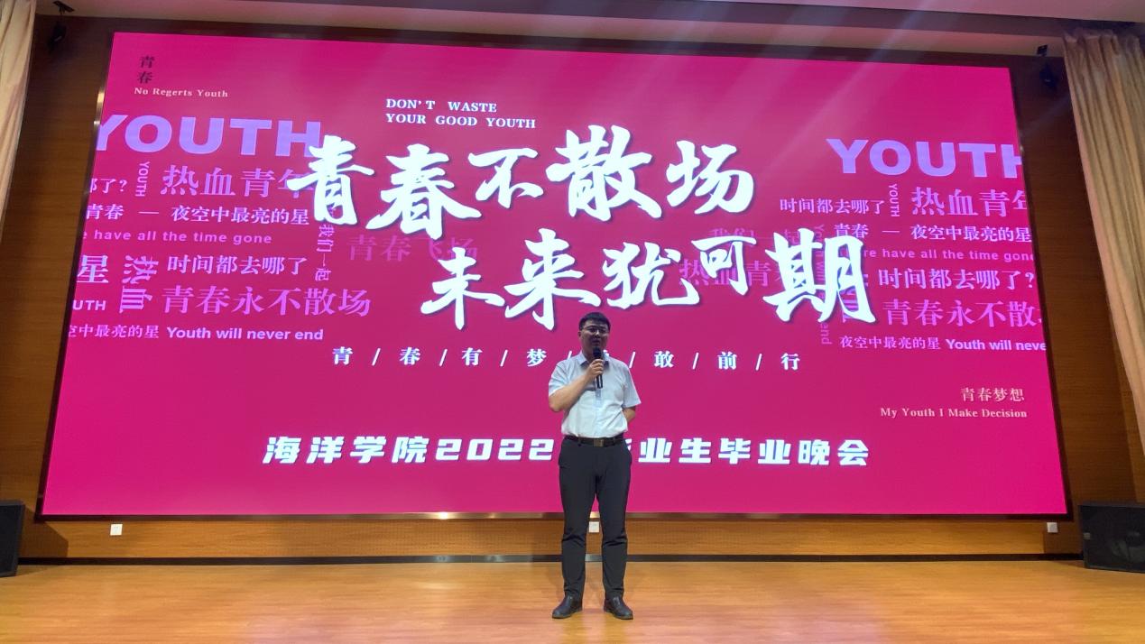 晚会上,毕业生感慨万千,哽咽声中有对学校和学院的衷心祝福,对恩师和同窗的真挚感谢,对学弟学妹的亲切叮嘱,千言万语道不尽离别情谊,最终汇成一句:海育英才,洋帆未来,以梦为桨,向海图强!鲜衣怒马少年行,青春不说再见!