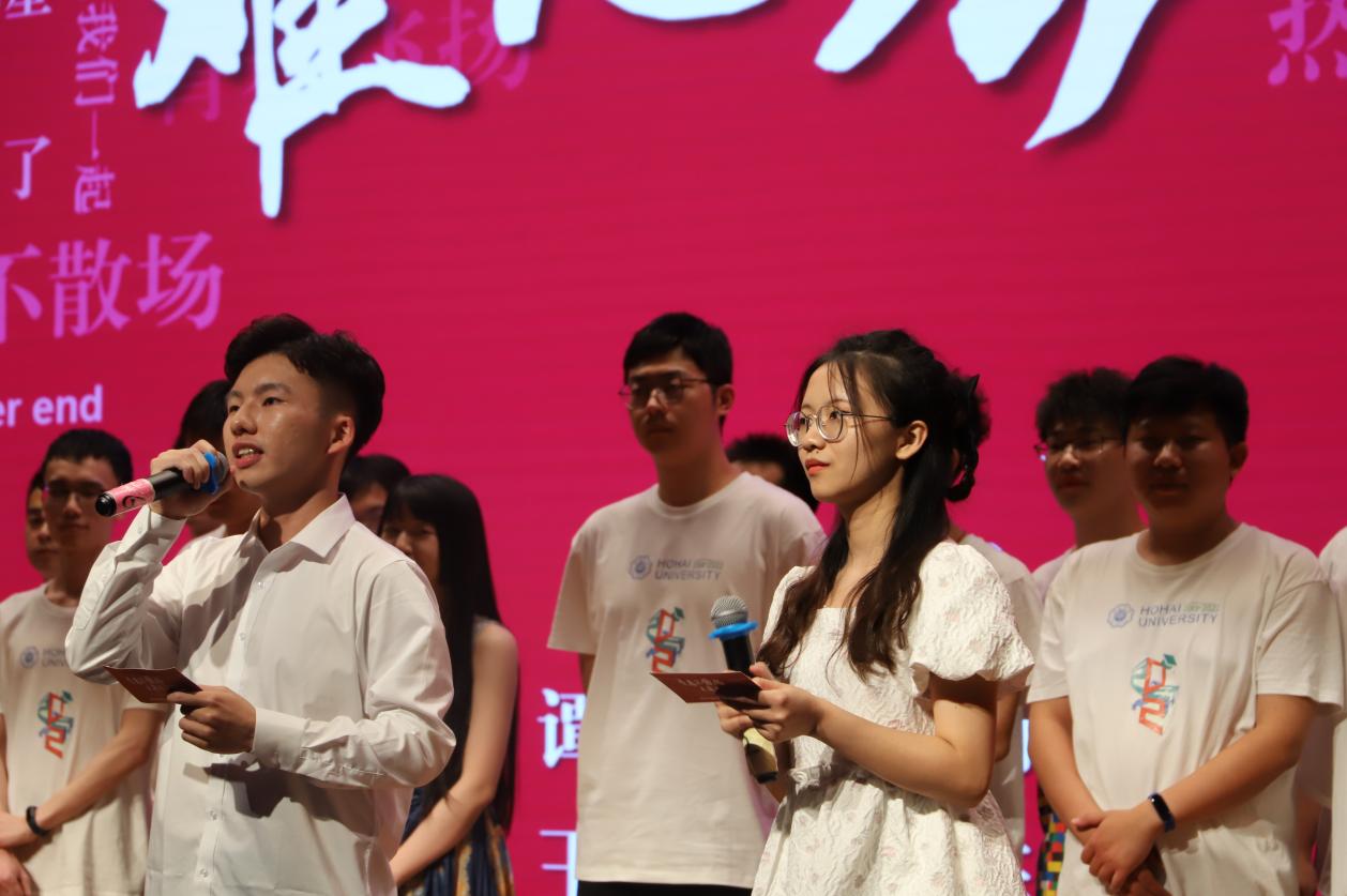 20级研究生刘焕宇以一首《守护解放西》向全场观众展现了湘江的赤诚豪爽,热烈点燃舞台。18级本科生陈劭雯、付可欣、李业蓝、吴梦霞带来的动感舞蹈《你没事吧》嗨翻全场。20级博士生胡逍锴、21级博士生王冠以《孤勇者》、《听不到》及《凤凰花开的路口》三首金曲串烧,为即将离别的学弟学妹送上深切祝福。小品《甄学家在河海》将海洋学子精湛的模仿表演能力展现地淋漓尽致,甄嬛体金句频出,引得观众捧腹大笑。经过魔性改编的《两只老虎》舞蹈,为大家带来了全新的演绎形式,将童年的欢快与热烈的青春融为一体。器乐交汇,金声玉振,余音绕梁,器乐队一曲悠扬婉转的《样》为观众带来听觉上的盛宴。