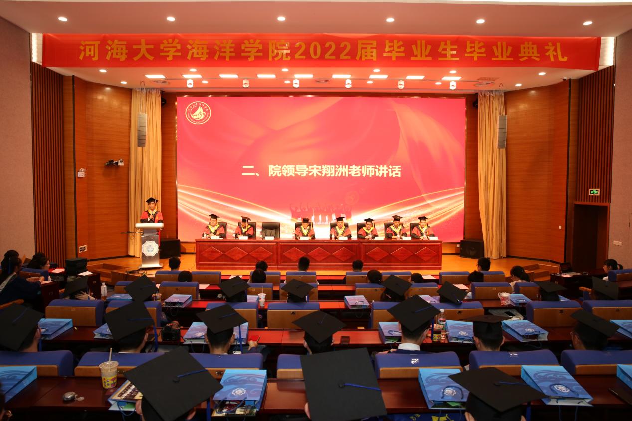 “钟灵毓秀石头城,人才蒸蔚起.....”全场师生起立齐唱娱乐城 校歌,典礼在庄严的校歌中拉开帷幕。院长宋翔洲在致辞中向毕业生表示热烈的祝贺和美好的祝愿,他通过分享成长经历与感悟,对毕业生提出几点期望,一是坚守梦想,学会生存,要时刻把海洋强国的国家战略放在至高的工作位置,把个人梦想和志向与新时代中国梦融为一体。二是坚持学习,学会自律,自律与学习是突破内卷的不二法门,更是实现人生进步的必要条件。三是坚守底线,学会变通,时刻保持底线意识,并勉励全体毕业生脚踏实地、不惧内卷,勇做新时代弄潮儿!