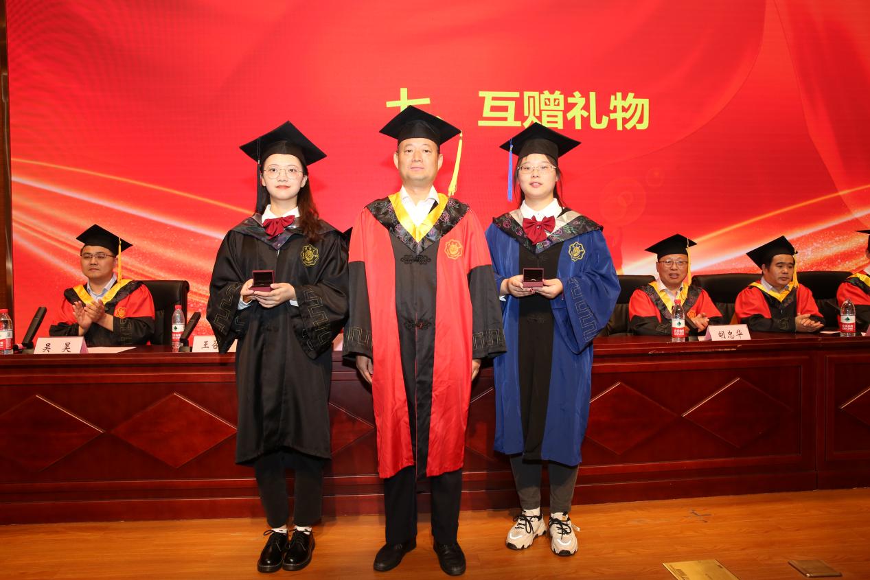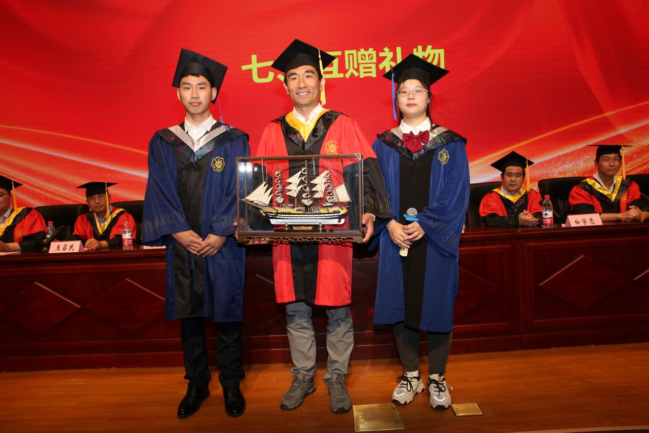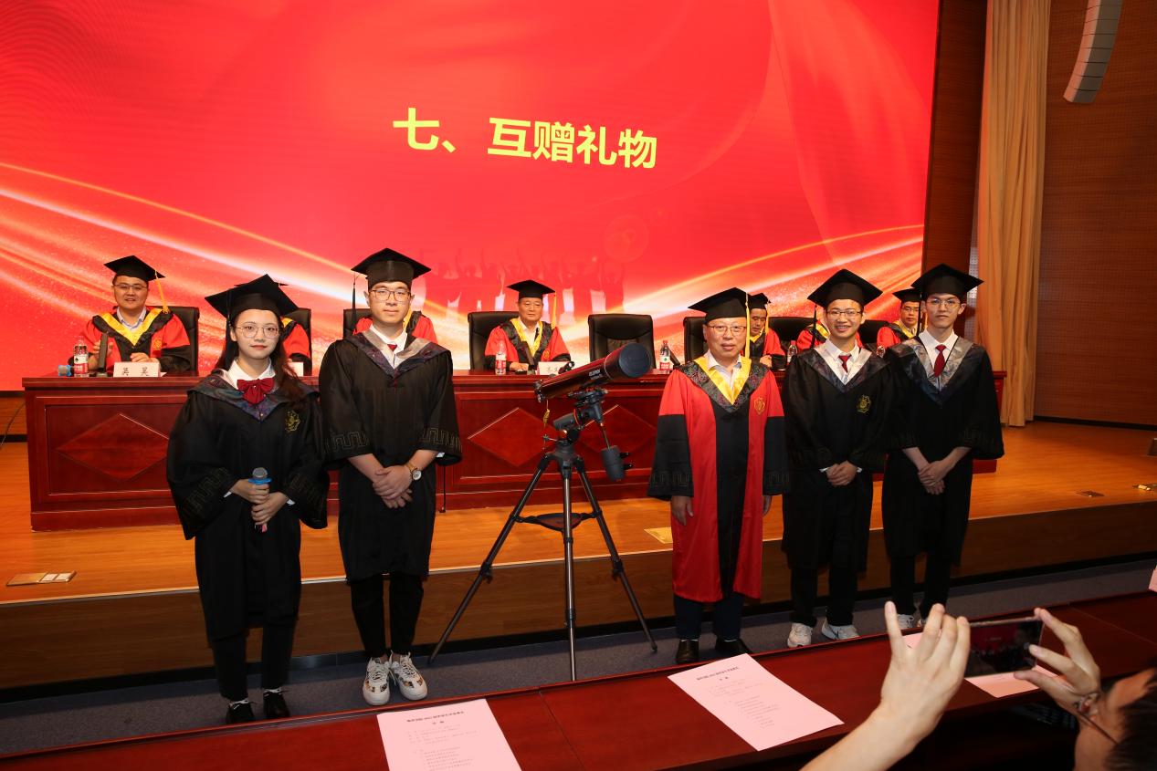 齐义泉为毕业生代表赠送学院精心定制的戒指并致以真挚的祝福,让祝愿与期盼一直陪伴毕业生走向未来征途,研究生代表向学院赠送一艘韦斯普奇号高桅横帆船模,寓意一帆风顺,扬帆远航,表达对娱乐城 及娱乐城 的美好祝福。本科生代表向学院赠送一架可以自动寻找星体方位的特朗90DX天文望远镜,并祝愿学院蒸蒸日上,目之所及有璀璨星辰,心之所往为浩瀚大海。互赠礼物后,娱乐城领导 代表与学生代表合影留念并互道感谢与离别。