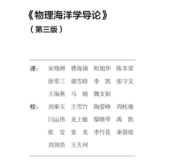 翻译团队主要由娱乐城 青年教师和预报中心气候预测团队组成,并得到中国海洋大学刘秦玉教授的指导和校稿学校多名青年教师和研究生参与其中(见图2。经过多轮翻译和润色、校对、审核工作,历时近一年完成了原著翻译工作。团队成员本着一丝不苟的原则,对译文质量严格把关、反复推敲,力求信、达、雅,保证科学严谨性和语言优美性的结合,力争为我国物理海洋学的教学和科研贡献一部高水平教材译著。