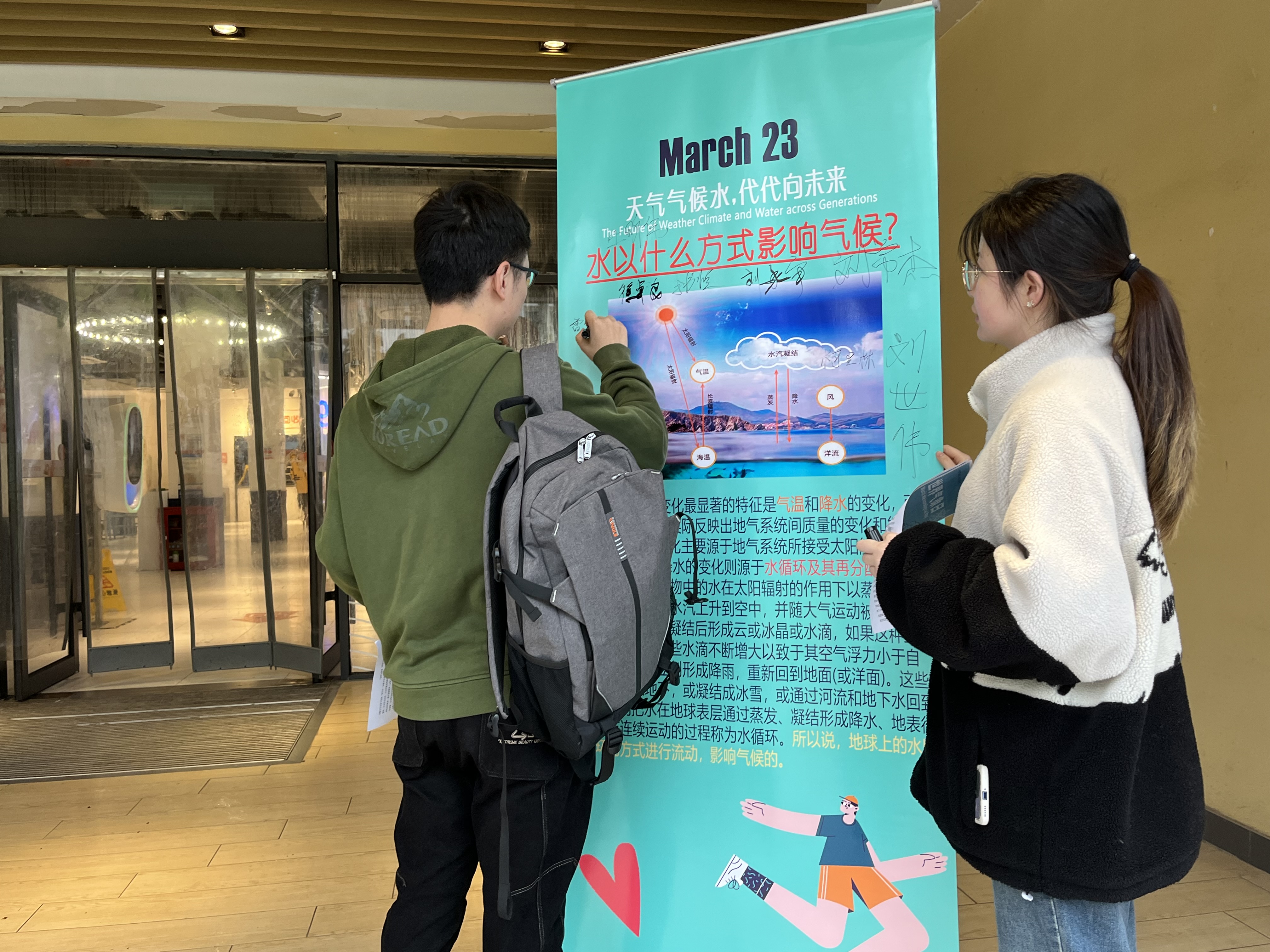 活动过程中,志愿者们通过发放宣传单,积极地引导更多同学去了解展板上的内容,鼓励大家关注我们的天气与气候系统,关注水资源在天气与气候系统中的重要地位;师生们通过阅读展板上的科普知识,在展板上签字立志,积极主动地向志愿者了解气候变化现状,增强了对天气、气候与水三者关系的了解,提高了保护环境、节约用水的意识。