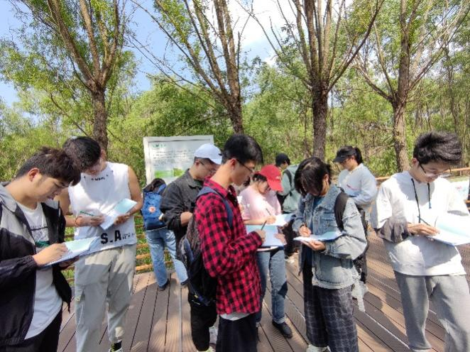 图6 同学们在上海崇明西沙国家湿地公园填写野外记录簿