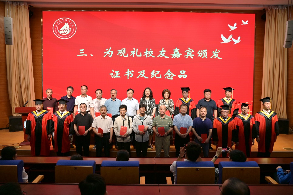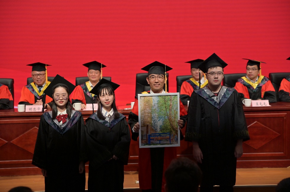 典礼上,学院党委书记胡忠华、院长宋翔洲为校友颁发荣誉证书,毕业生代表为校友嘉宾赠送承载河海记忆的纪念品——河海梧桐叶,校友代表为毕业生赠送祝福卡片,并合影留念。