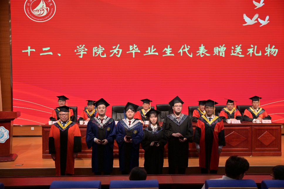 研究生代表向学院赠送一艘深潜器“蛟龙号”的模型,代表了2023届海洋科学硕士班对学院的祝福,希望学院继续“进军深海大洋,探索学科前沿,服务海洋经济”。本科生代表向学院赠送院楼照片的拼图,背后是所有同学的签名,拼图留存了2023届本科毕业生专属的河海记忆,承载了每一位同学对学院美好的祝福,祝愿学院蓬勃发展,蒸蒸日上。党委书记胡忠华、院长宋翔洲为毕业生代表赠送学院精心定制的戒指并致以真挚的祝福,让祝愿与期盼一直陪伴毕业生走向未来征途,赠礼物后,娱乐城领导 代表与学生代表合影留念并互道感谢与离别。
