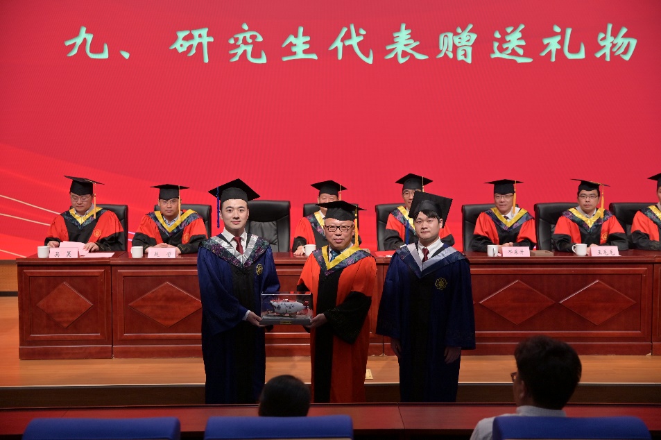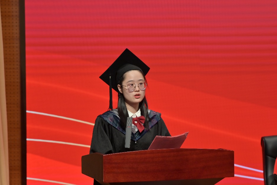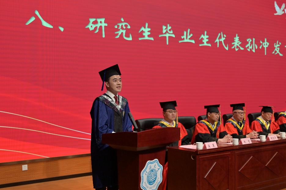 研究生毕业生孙冲作为研究生代表表达了对校园生活的怀念、对师长的感激以及对母校的祝愿。他表示,三年时光他们在用不懈的努力和汗水诠释着一个平凡却属于自己的青春,收获着一份朴实却来之不易的成熟。本科生毕业生代表陈雨卉表达了对母校的感激之情,并表示立志要做一个有担当、有抱负的青年,牢记学院的教诲,明辨是非,坚守本心,去追求心中的真理。