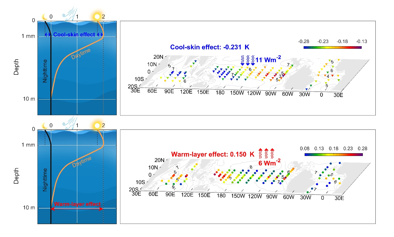 团队利用全球热带锚系浮标资料估算了热带冷皮和暖层效应,指出: