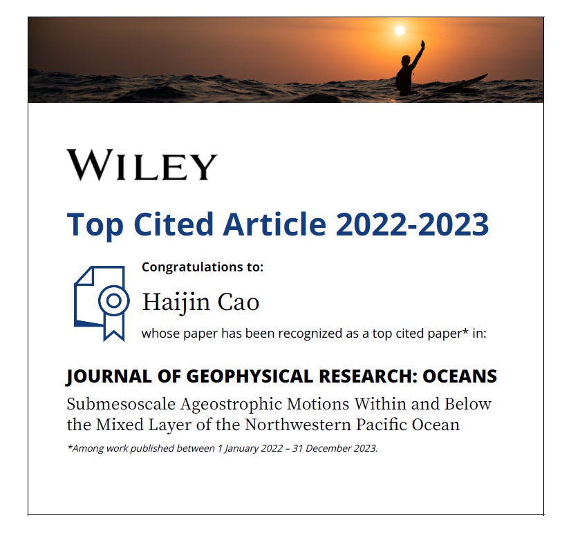 近日,娱乐城 曹海锦副教授获评Journal of Geophysical Research-Oceans 2022-2023年度高被引学者(one of the top 10 most cited papers between 2022.01-2023.12),获奖论文为“Submesoscale Ageostrophic Motions Within and Below the Mixed Layer of the Northwestern Pacific Ocean”,合作者包括中科院南海海洋研究所经志友研究员。