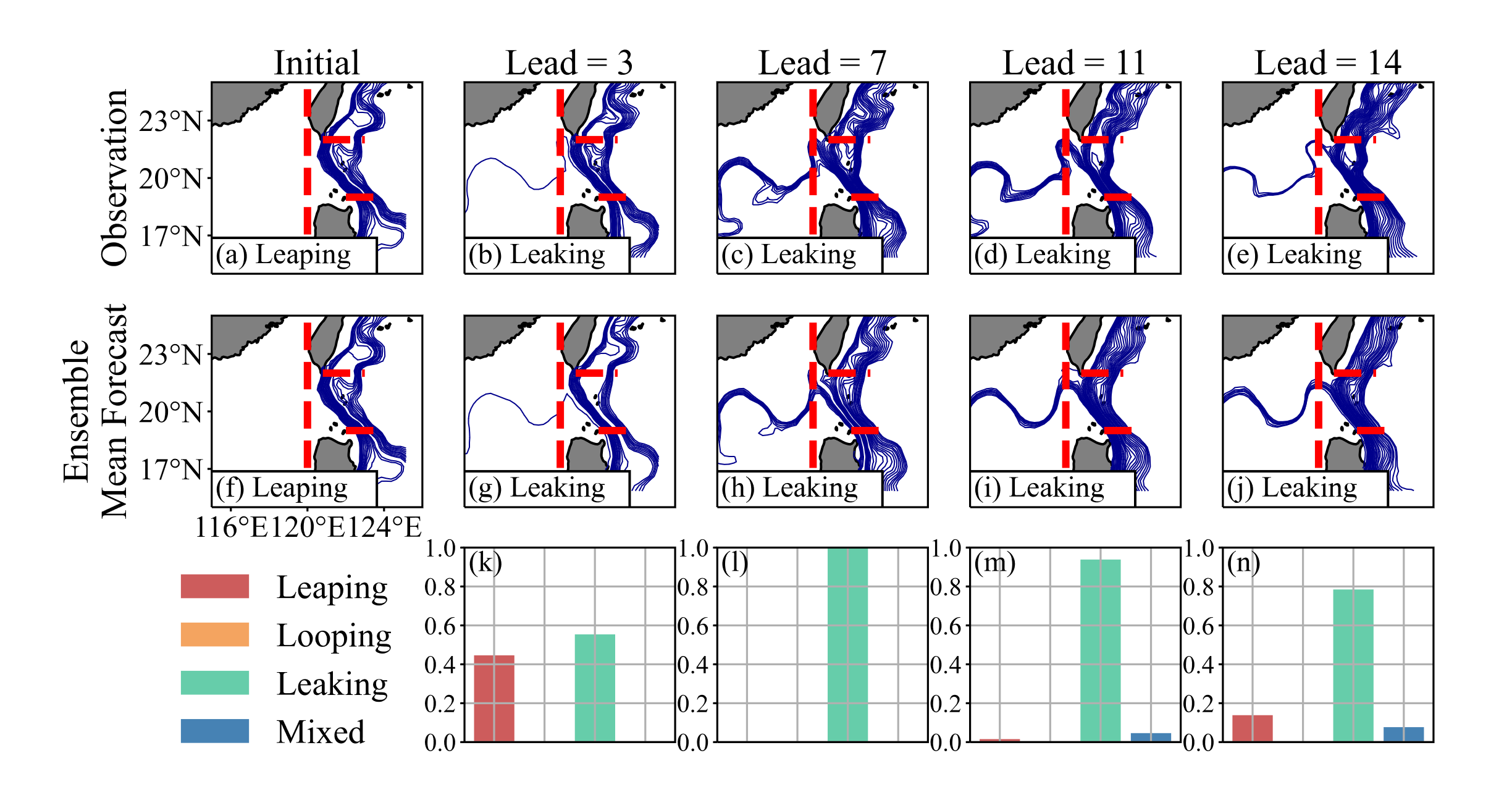 图2. 以2020年1月17日为起始预报时刻,在不同预测时长,黑潮集合预测系统的预测(中间)与AVISO观测(顶部)的黑潮路径及相应类型。概率密度函数(底部)表示黑潮路径类型的可能性。在预测时期,黑潮从跨越路径转变为泄漏路径。