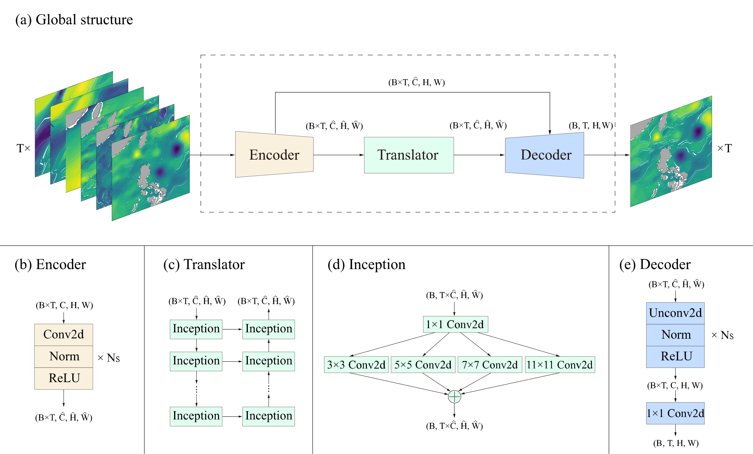 图1. 黑潮预测系统模型结构。输入为海面高度异常、经、纬向地转流速、海面温度、经、纬向风应力。