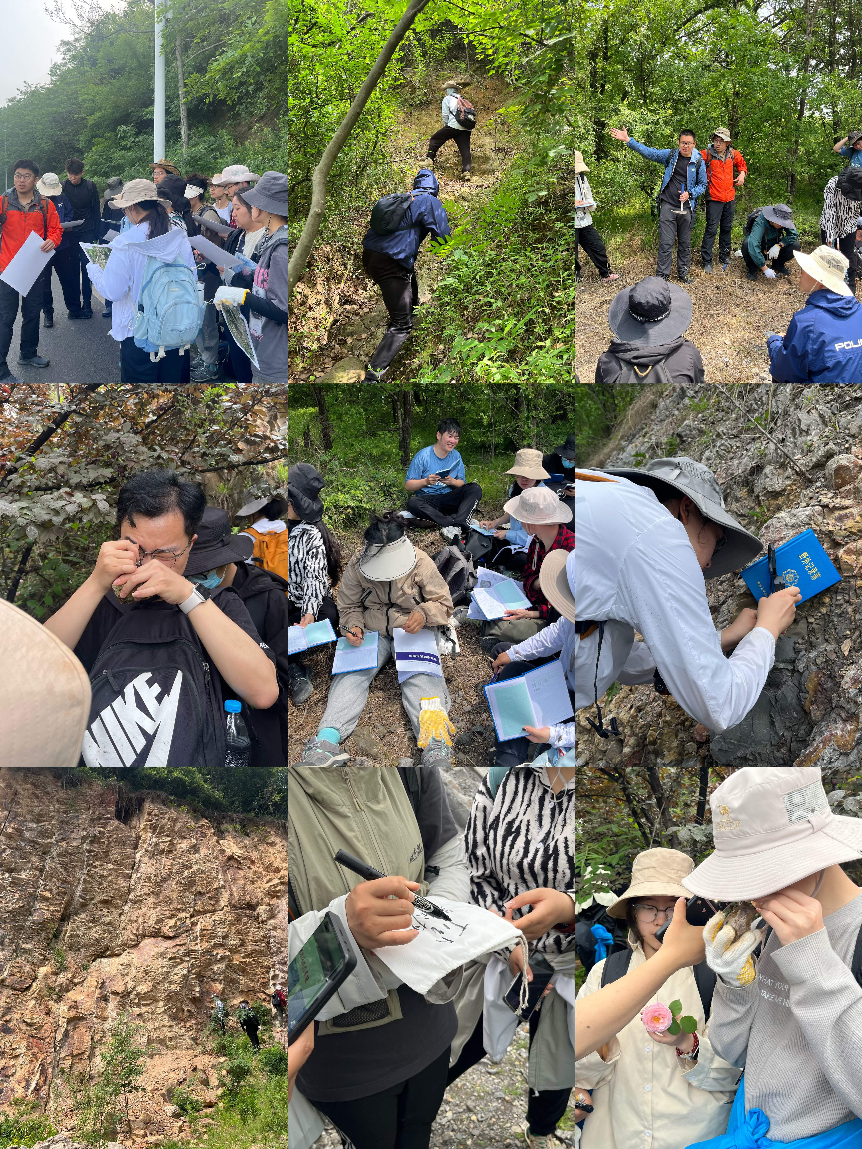 地质踏勘阶段共3天时间,4月27日师生一行人来到巢湖狮子口地区。在老师们的指导下,同学们全面学习了三点定位法、产状测量等野外地质技能,对沿路的露头进行观察、取样、描述。随后在28、29日,师生们又前往凤凰山、平顶山进行地质踏勘,全面了解该地区的典型地层剖面、填图单位的划分标志、各类地质体的主要特征、分布范围和接触关系、主要标志特征和矿产情况,为后续的填图工作作准备(图3)。踏勘阶段有时会遇到下雨天气,但师生们工作热情高涨,风雨无阻(图4、图5),在确保安全的前提下,尽量不耽误实习安排。
