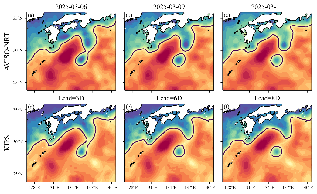图3. 以2025年3月3日作为起始预报时刻,KIPS预测时长为3、6和8天的预报结果,以及相应时刻的卫星观测(AVISO-NRT)