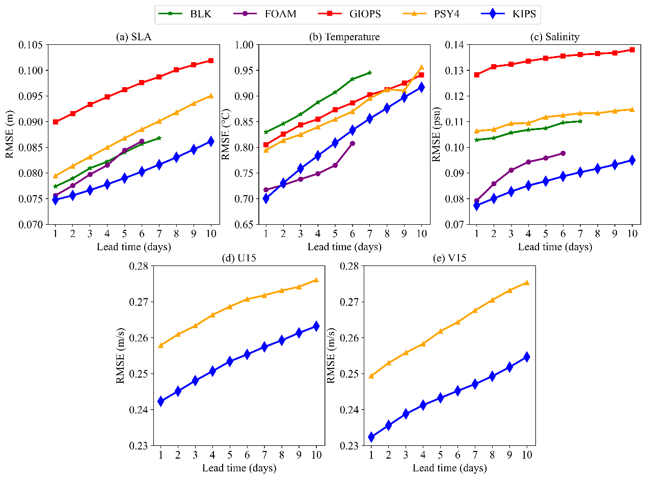 利用 IV-TT Class4框架对KIPS进行评估,KIPS提前10天海面高度、温度、盐度和流场预报均方根误差(RMSE)分别为7.9cm、0.81°C、0.087psu和0.25m/s,优于BLK、GIOPS、FOAM和PSY4等国际先进的数值预报系统(如图2所示)。
