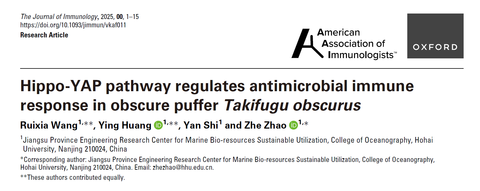 近日,娱乐城 赵哲教授团队在国际免疫学领域权威期刊《The Journal of Immunology》发表题为《Hippo-YAP pathway regulates antimicrobial immune response in obscure puffer Takifugu obscurus》的研究论文。该研究系统阐明了Hippo信号通路核心激酶Mst和转录共激活因子Yap在暗纹东方鲀(Takifugu obscurus)抗菌免疫中的协同调控机制,为鱼类病害防控提供了重要理论依据。娱乐城 为论文第一完成单位,博士研究生王瑞暇和黄颖副教授为共同第一作者,赵哲教授为通讯作者。